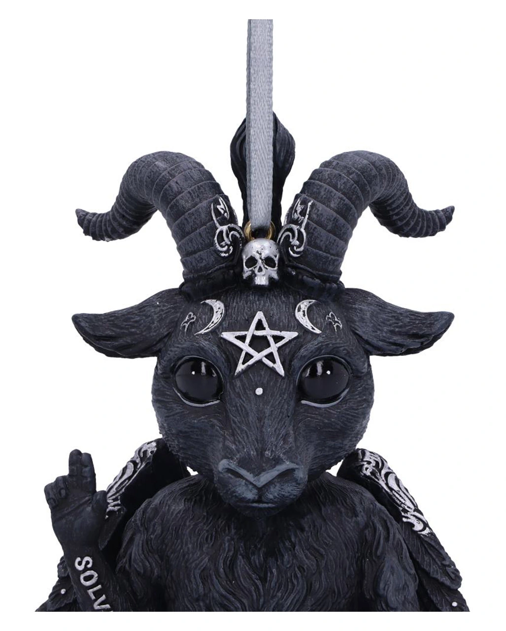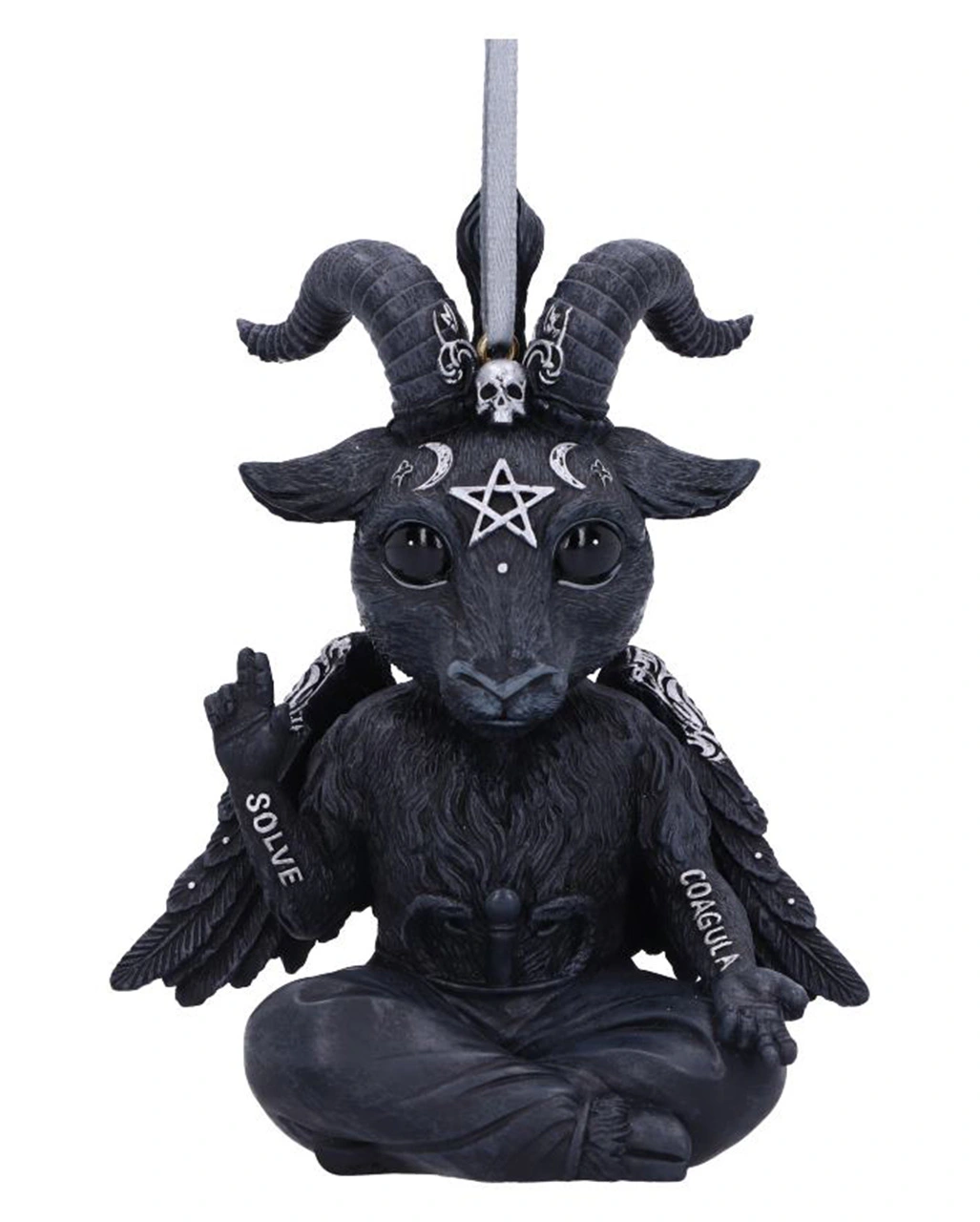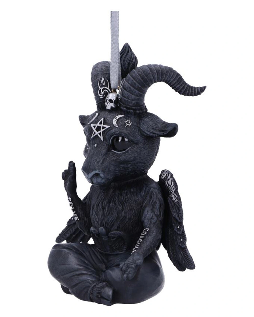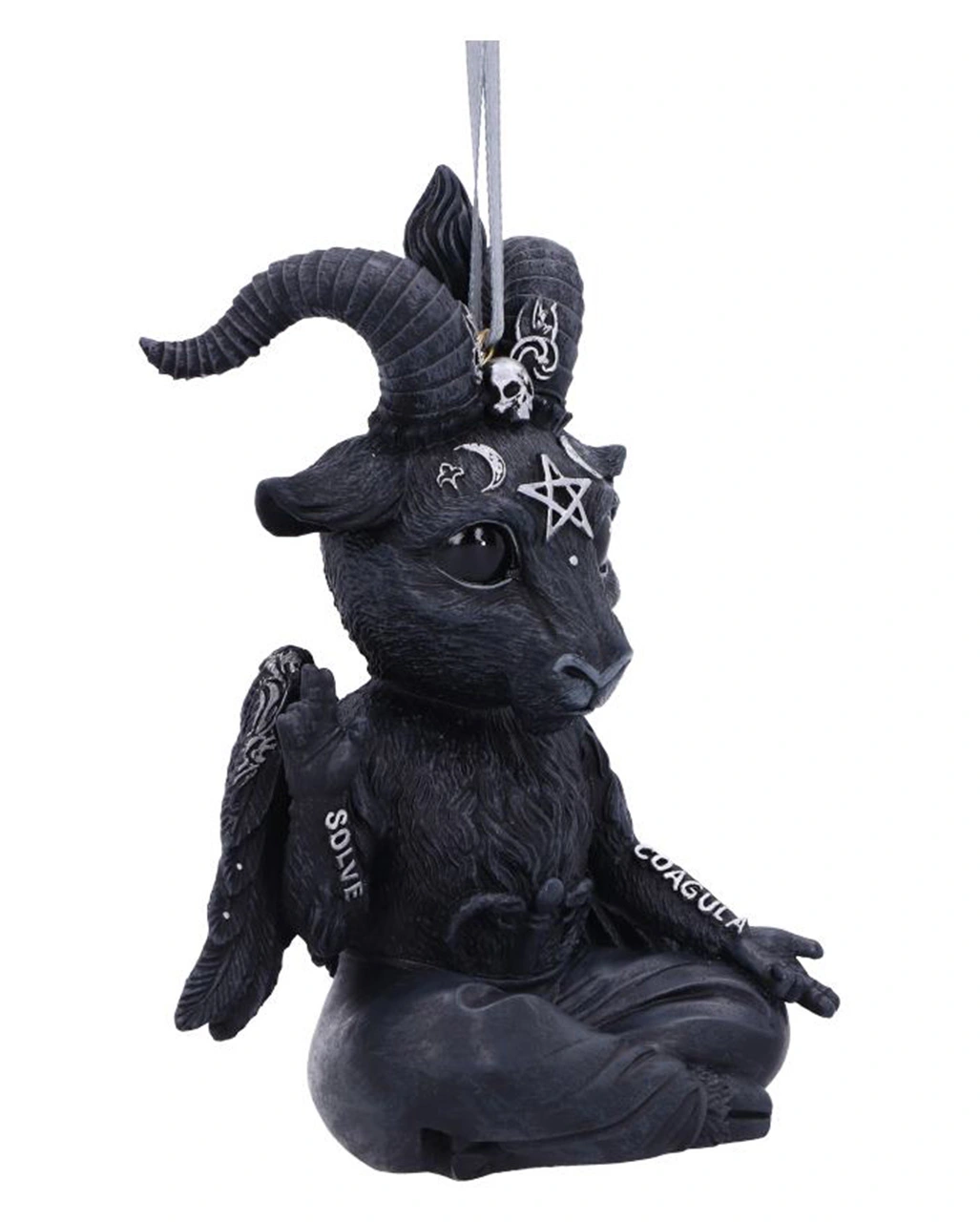 Unser süßer Baby Baphomet sitzt mit großen Augen im Schneidersitz da und hält seinen rechte Arm empor. Auf dem Unterarm steht das Wort SOLVE (Trennen). Der linke Arm ist einladend nach außen gestreckt und auf dem Unterarm ist das Wort COACULA (Zusammenfügen) zu erkennen. Mit dieser okkulten Baphomet Hängefigur bekommt dein Weihnachtsbaum eine ganz besondere Deko verpasst!