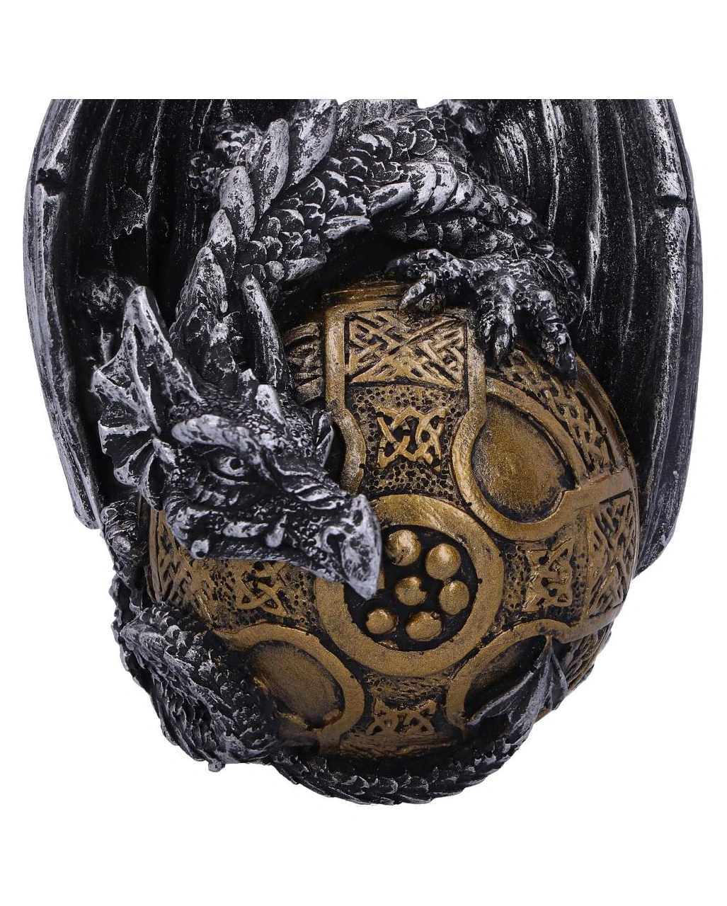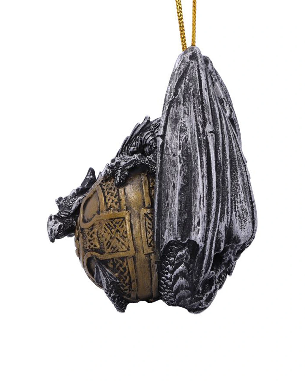 Unsere Drache mit Keltenmuster Christbaumkugel klammert sich an eine wunderschön gearbeitete Goldkugel. Mit komplexen Tribals verziert und zentriert durch ein keltisches Kreuz, ist das Gothic Ornament eine festliche Weihnachtskugel. Unser Drachen Weihnachtsschmuck eignet sich aber genauso als ganzjährige, außergewöhnliche Fantasy-Deko.