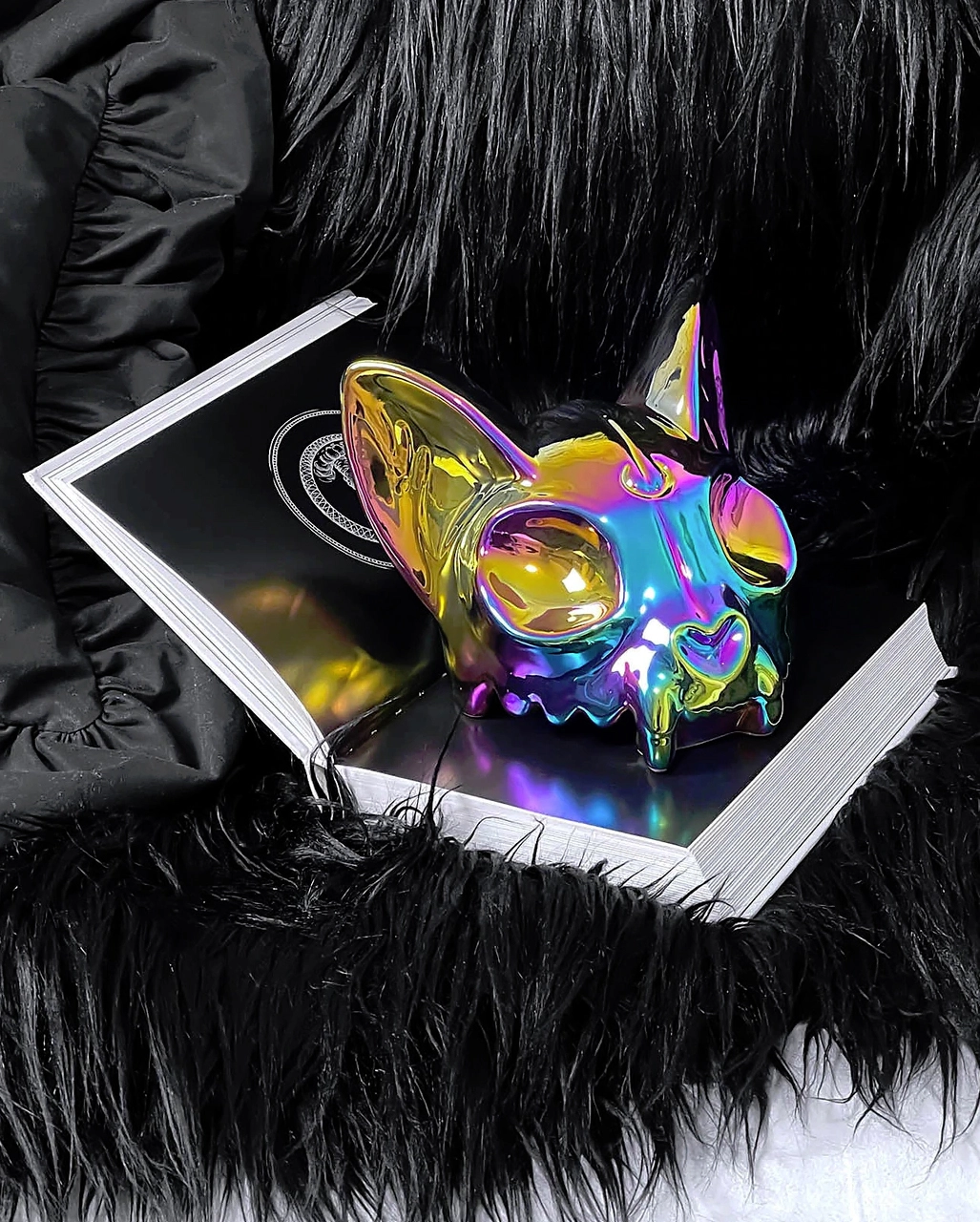 Bunt irisierender Katzen Keramik Totenschädel als Gothic Dekoration