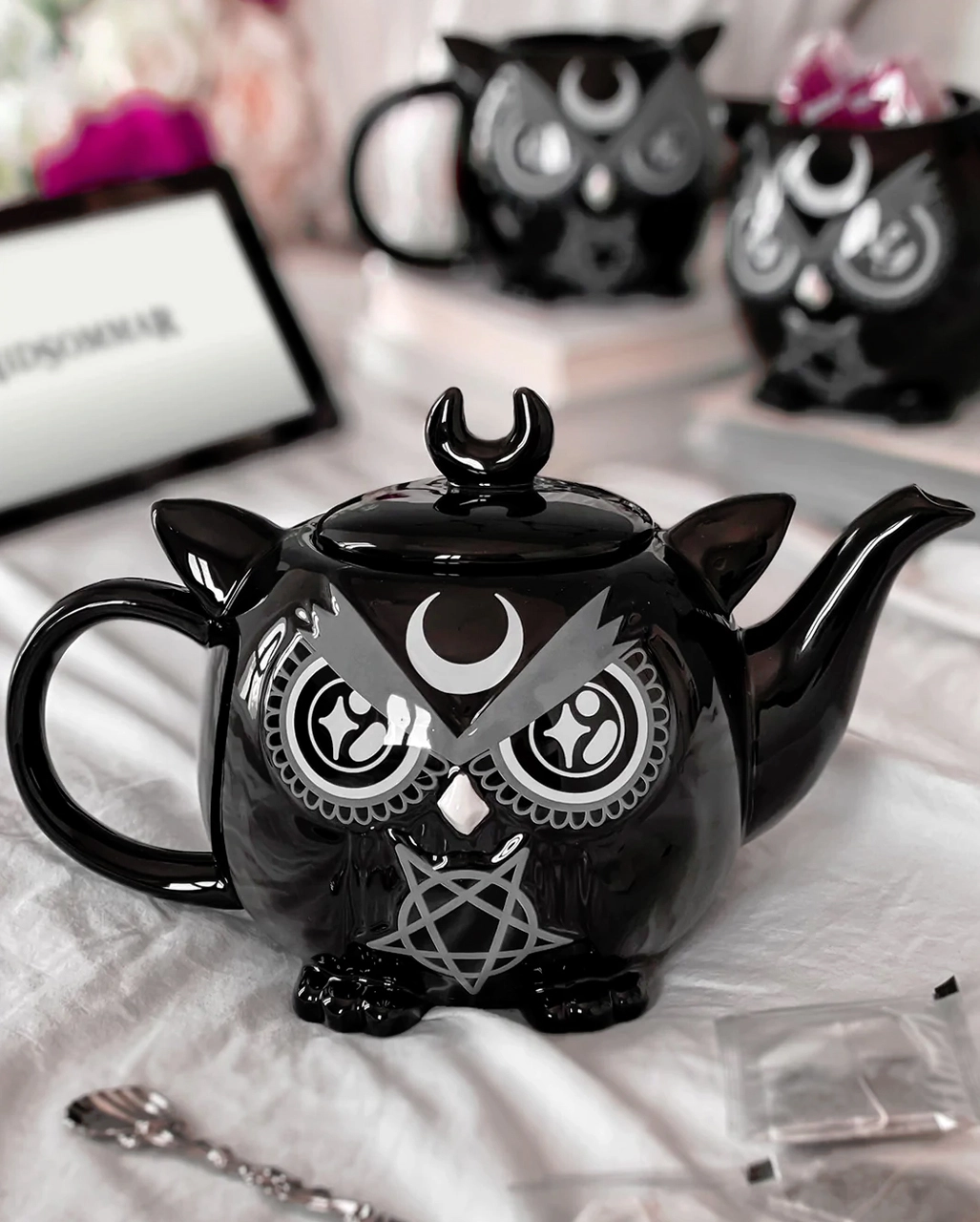 Die Owl Teekanne KILLSTAR bietet die perfekte Inspiration für Hobby Hexen und Okkultisten. Vor allem, wenn sie Freundinnen und Freunde zum Kaffeekränzchen eingeladen haben. Die extravagante Keramikkanne sollte dafür in jeder Hexenküche bereit stehen, um Kaffee oder Tee zu servieren. Dann schmeckt es den Gästen noch mal so gut. Schließlich trinkt auch das Auge mit und die hochwertige Gothic Kanne im Eulen Design ist ja wohl ein echter Hingucker auf dem Tisch.