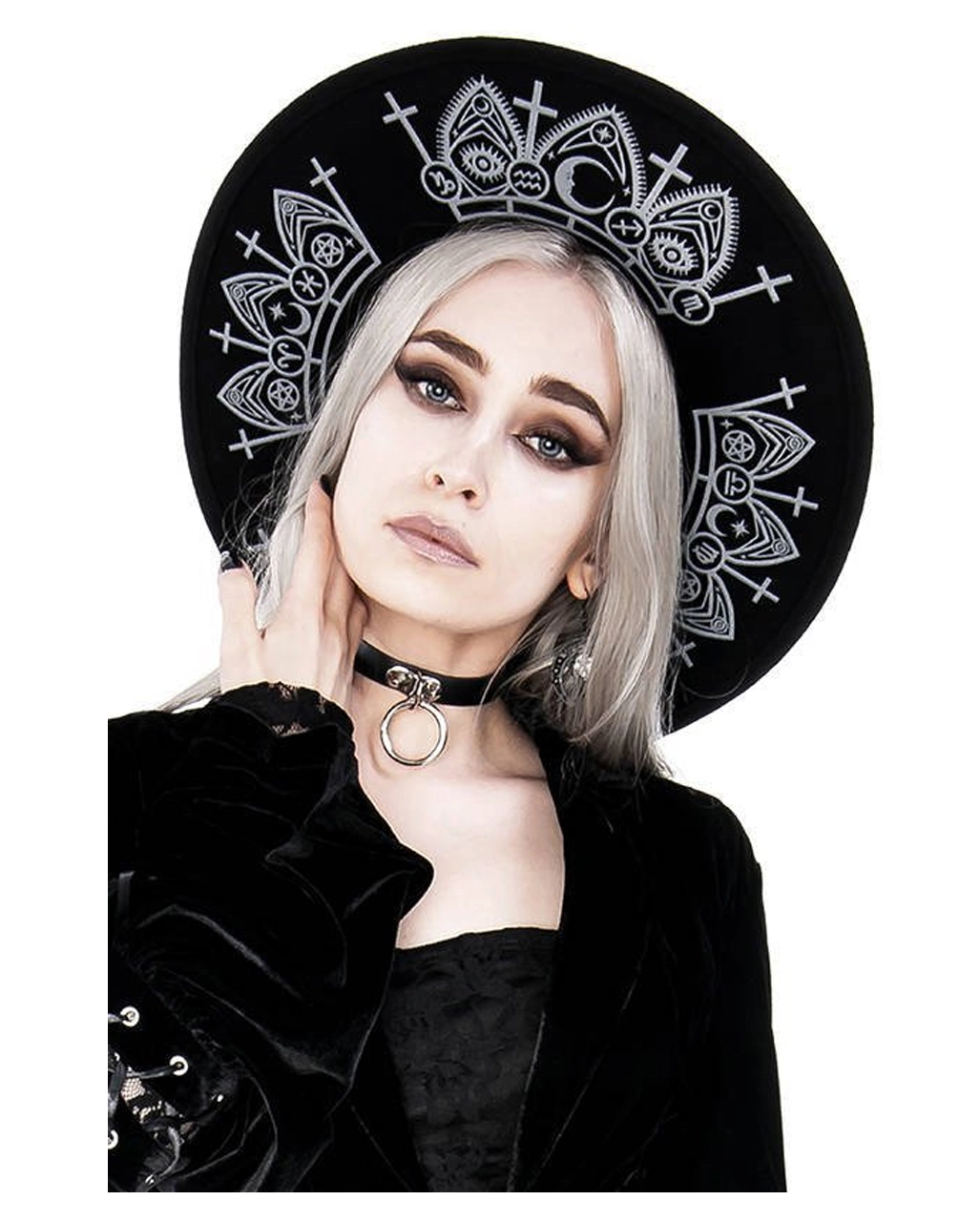 Was wäre die moderne Gothic Hexe ohne einen schwarzen Hexenhut mit Astrologie Symbolen? Unser wunderschöner Fedora mit breiter Krempe ist die ideale Ergänzung zu deinem düsteren Gothic Hexen Kostüm! Damit wirst Du zum Mittelpunkt aller Halloween Partys. Als waschechte Hexe, die auch im Alltag gerne in ihrem Hexen Outfit für Aufsehen sorgt, weißt du natürlich, wie man einen magischen Auftritt hinlegt. Kein Frage, dass Du nicht mehr ohne diesen außergewöhnlichen Halloween-Hut aus dem Haus gehst.